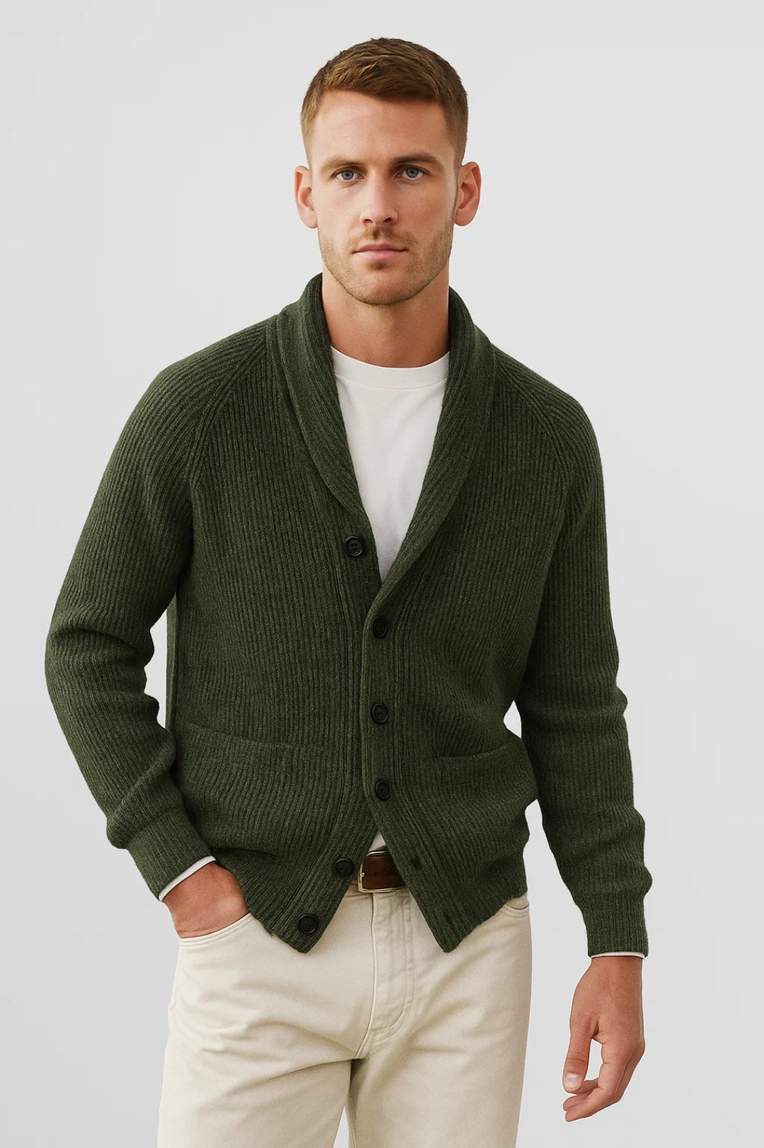 Ten dzianinowy model męski z kołnierzem szalowym oferuje klasyczny wygląd i dodatkowe ciepło wokół szyi. Gruba struktura i głębokie odcienie kolorów czynią go wszechstronnym wyborem na warstwy w jesieni.