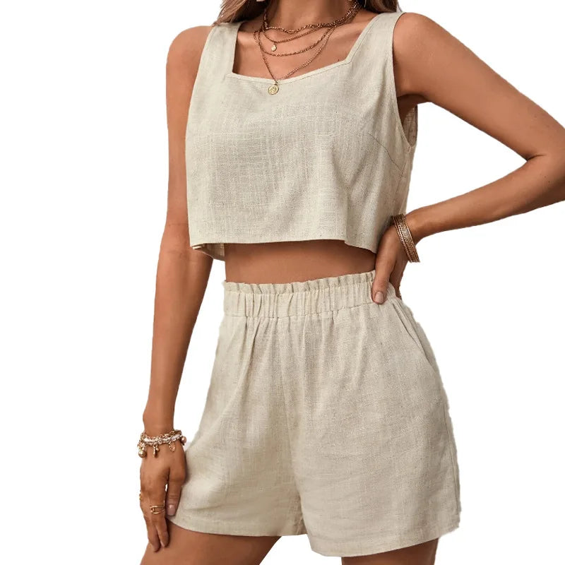 Kobieta | Elegancki Letni Zestaw Lniany | Top Bez Rękawów z Otwartym Tyłem | Krótkie Spodenki | Stylowy Komplet